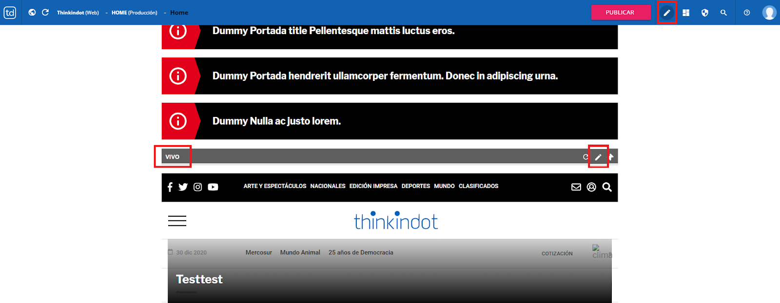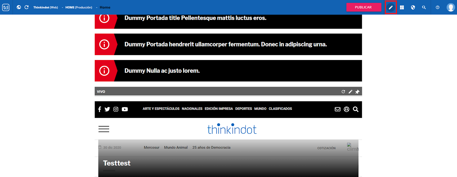 Primero, deberás ingresar a Thinkindot CMS en Modo Contenido, aplicación Portada donde se visualizará la Página Home.
