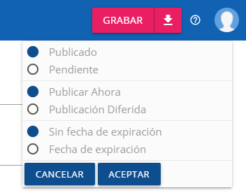 Para finalizar, clickea la flecha a la derecha del botón grabar, asegúrate de que el estado de publicación sea “Publicado” y clickea en Aceptar.