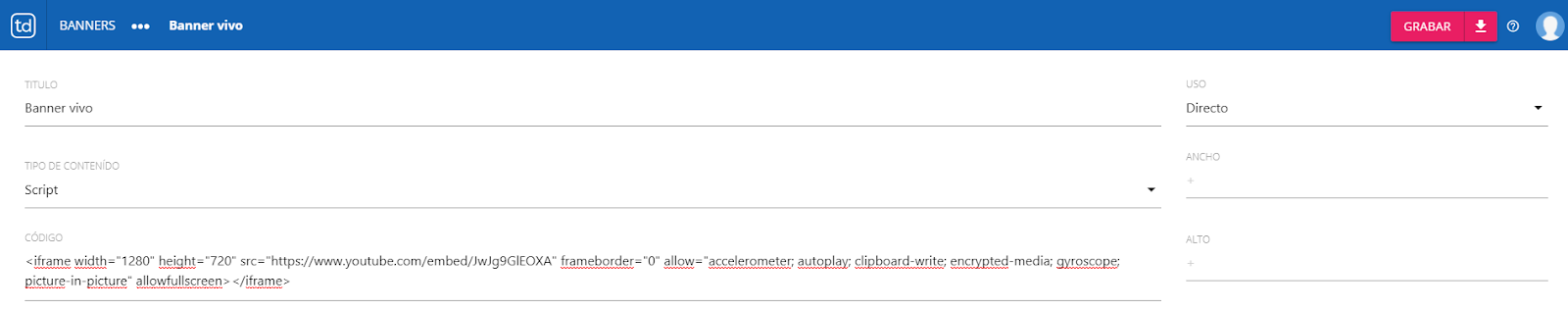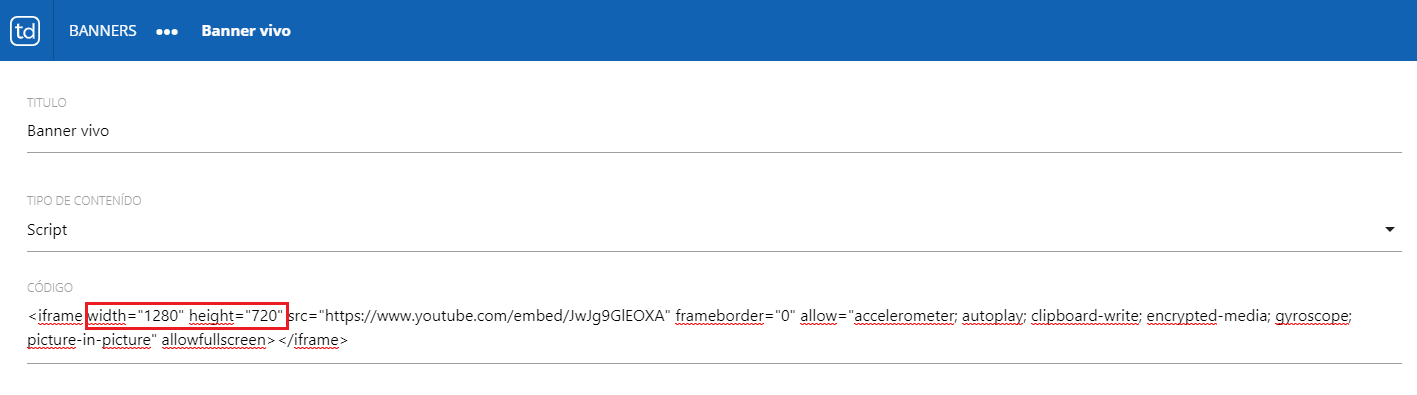 Importante! Si deseas ajustar el tamaño del vivo, en el código de Youtube insertado, hay dos parámetros; width y height. Al cambiar estos números, se cambiará el tamaño del video insertado.
