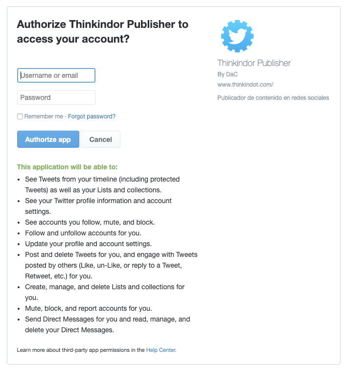Login: Si el portal posee la funcionalidad de registro de usuario, esta función permite a los lectores loguearse en el sitio con sus usuarios de Twitter. Para facilitarte el proceso, el sistema completa estos campos de forma automática con los datos necesarios para que puedas integrar tu aplicación con tu portal creado en Thinkindot®.