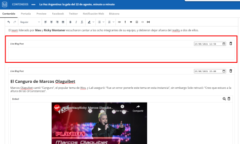 ¿Qué formato tienen que tener los posts del Live Blog Posting? Fecha y Hora: Cada post viene por default con la fecha y hora que se embebió el post en el cuerpo de la nota. La fecha puede ser editada.