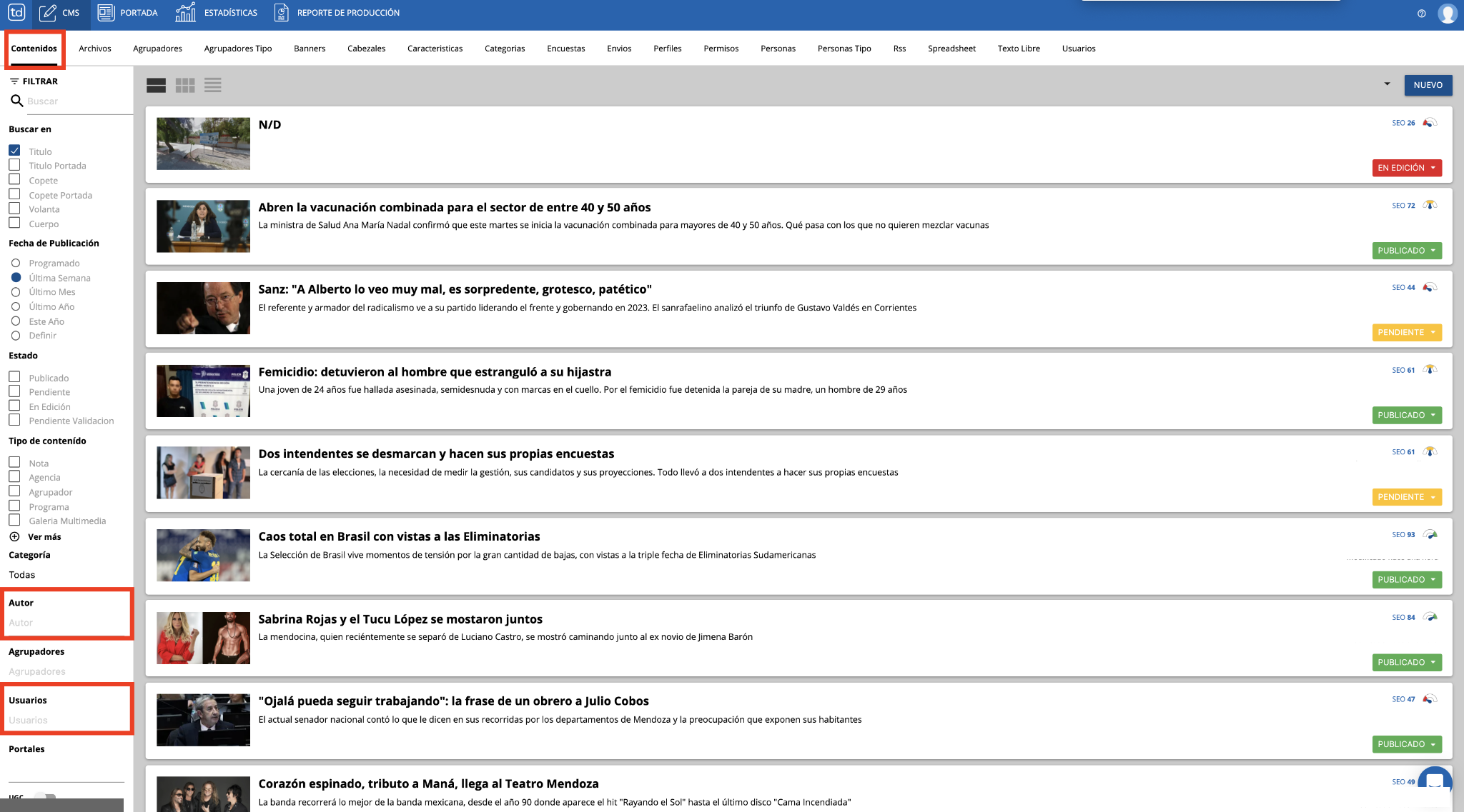 Desde el editor de CMS en la solapa CONTENIDOS encontrarás una serie de campos para filtrar y encontrar la información cargada hasta el momento