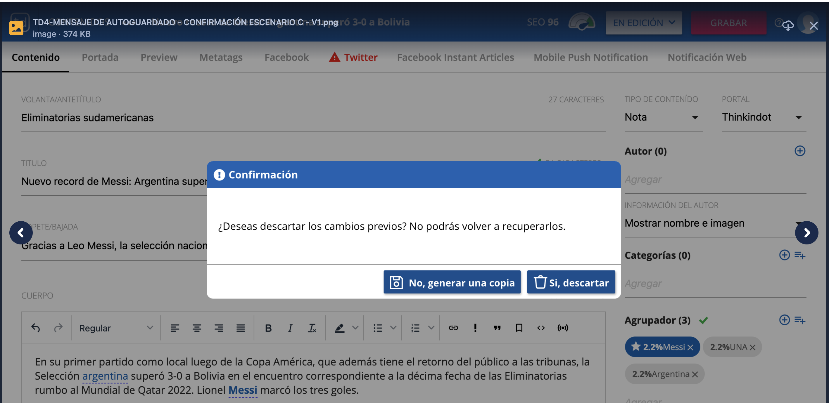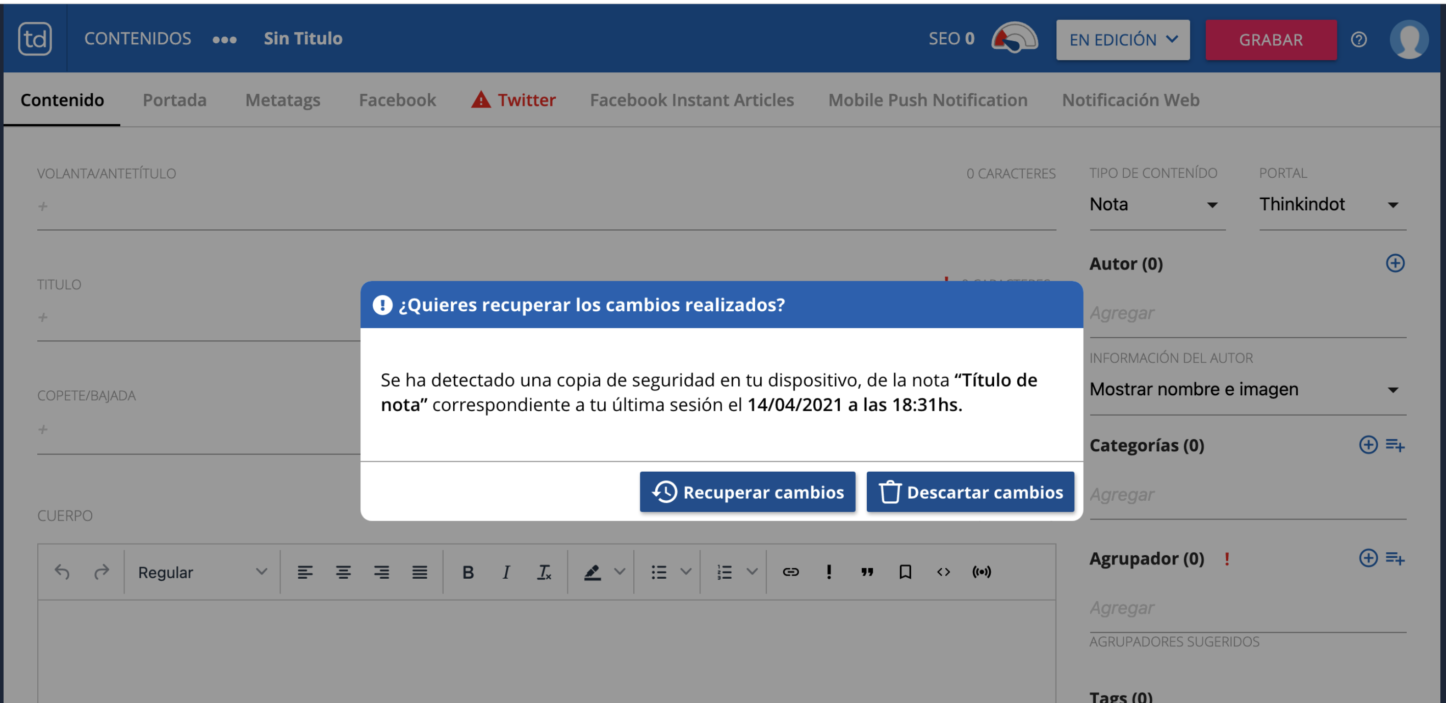 El CMS de Thinkindot® posee funcionalidades que facilitan la gestión diaria de tus notas, por eso y entendiendo que los imprevistos existen, en la versión 4.8 incorporamos el auto guardado para que pase lo que pase no pierdas el trabajo realizado.