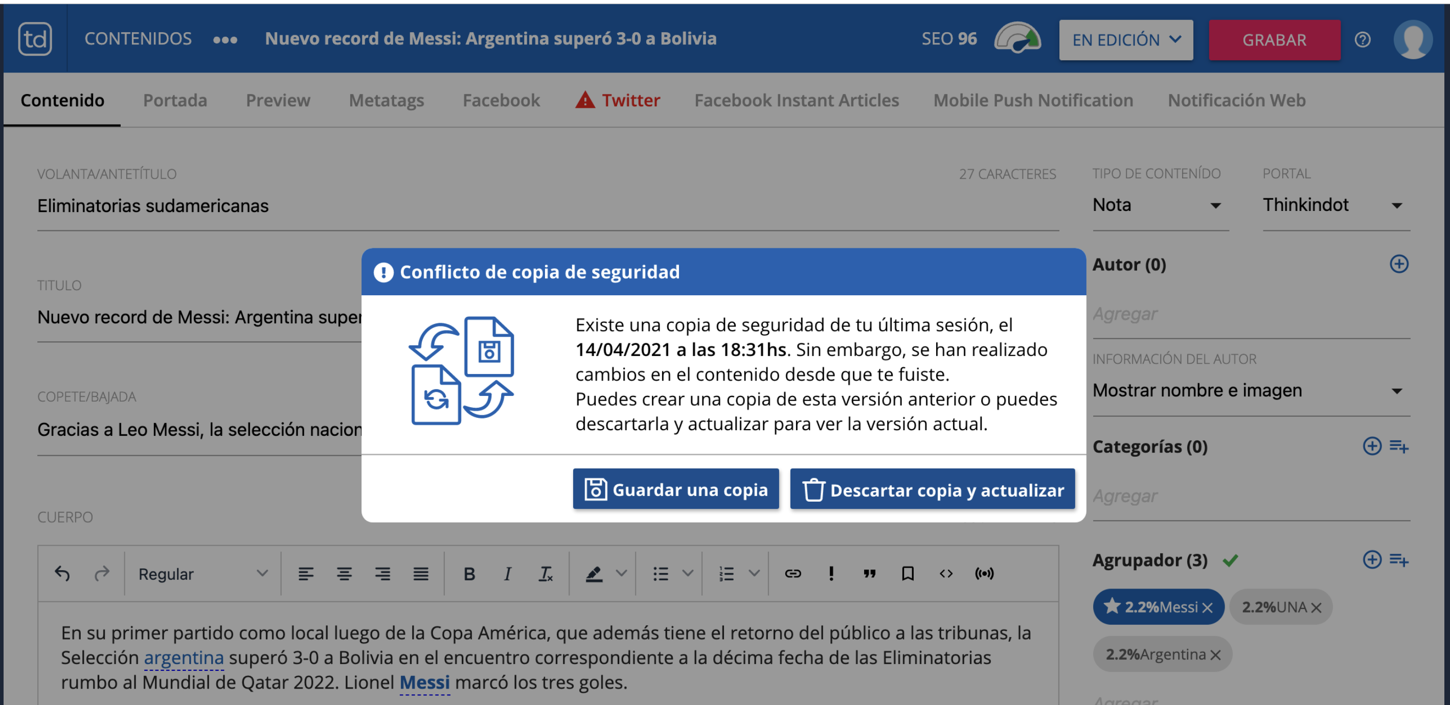 • Si un colaborador mientras tiene el editor de contenido abierto y es desbloqueado por otro usuario sin guardarlo, este escenario es donde un usuario que solicita el desbloqueo a quien lo tenia abierto y nunca obtuvo la confirmación de nota liberada, por lo que tomo acceso “a la fuerza”. El CMS lo alertará dando la opción de actualizar a la última versión o guardar la versión trabajada y no guardada como una nota nueva para poder revisarla e incorporar sus cambios a la versión publicada.