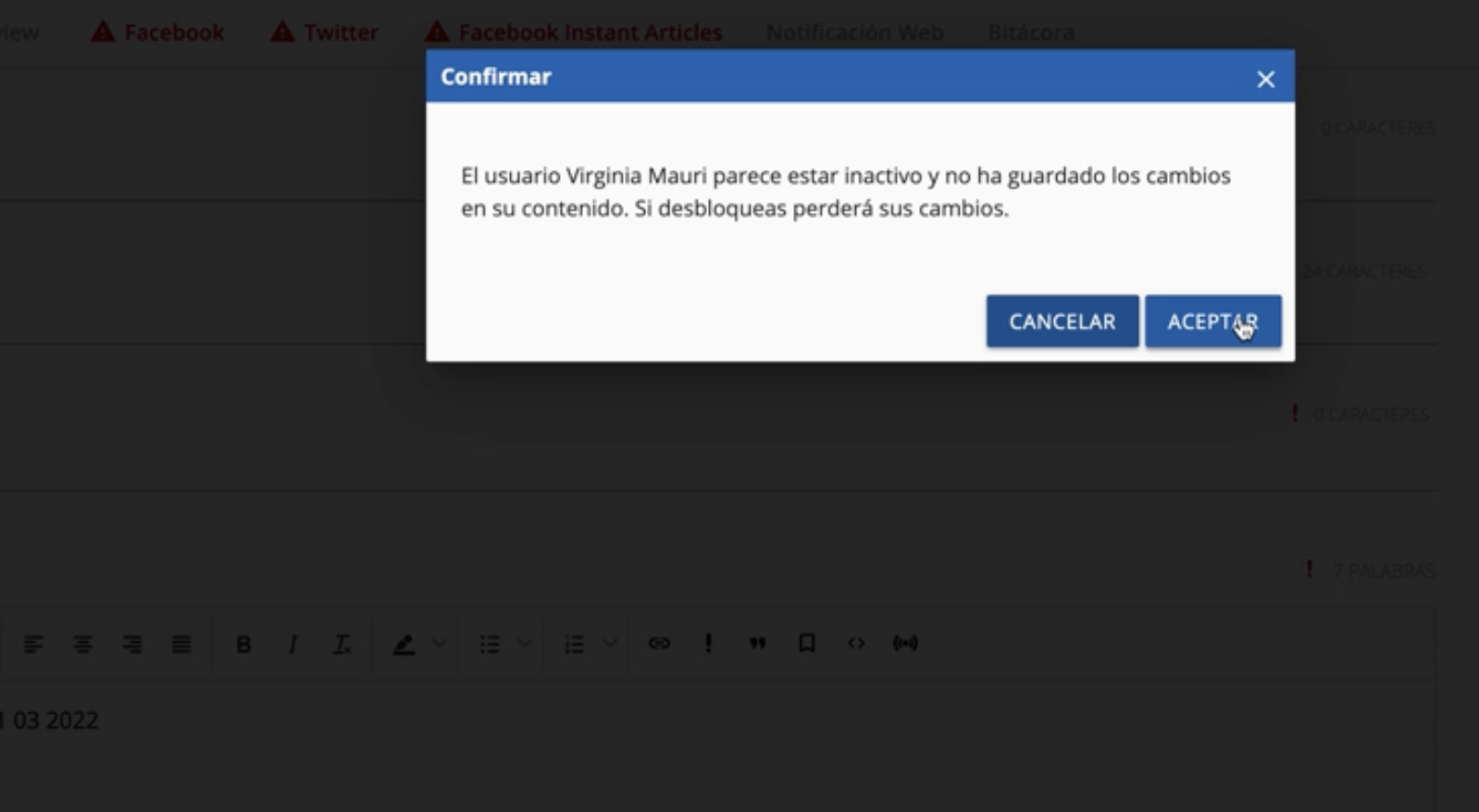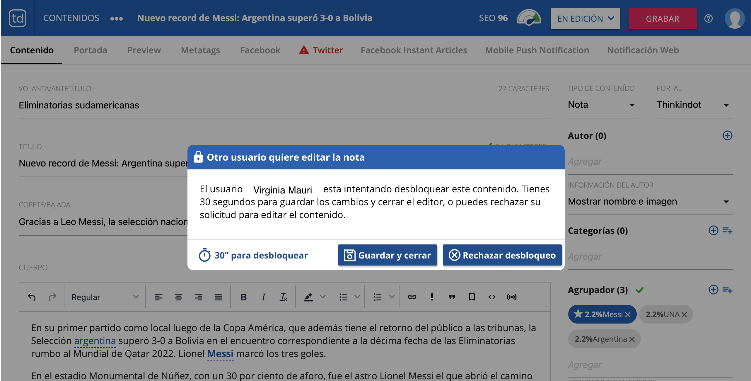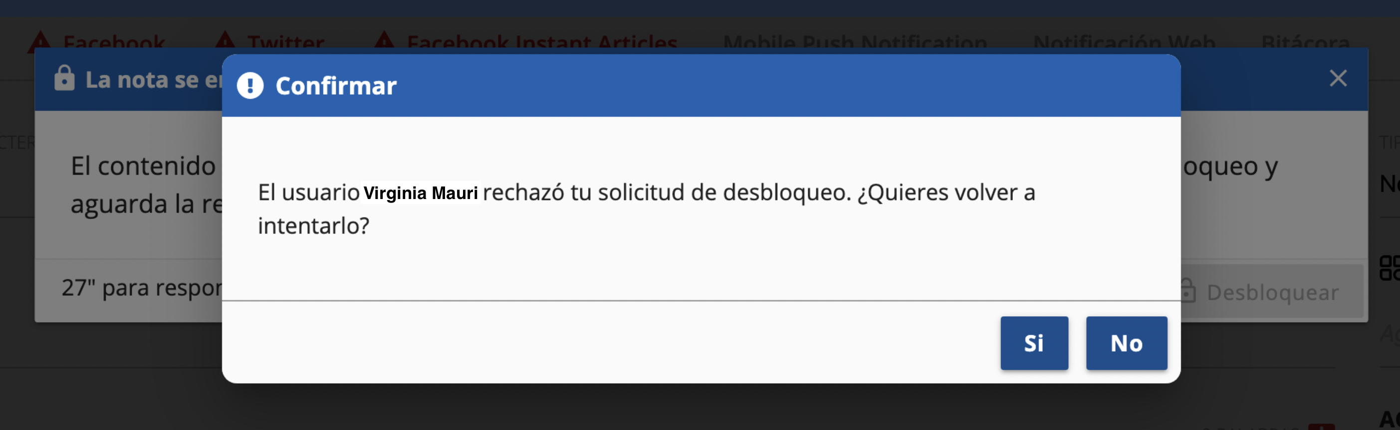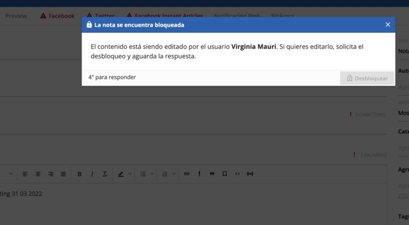 Ahora, el CMS advierte a los usuarios que están editando un contenido, que otro miembro de la redacción quiere acceder a la misma nota, cómo lo hace? muestra una alerta en el usuario que esta en el editor que el usuario XX esta queriendo ingresar a la nota, y cuenta con tres opciones, permitir, grabar y liberar o rechazar.