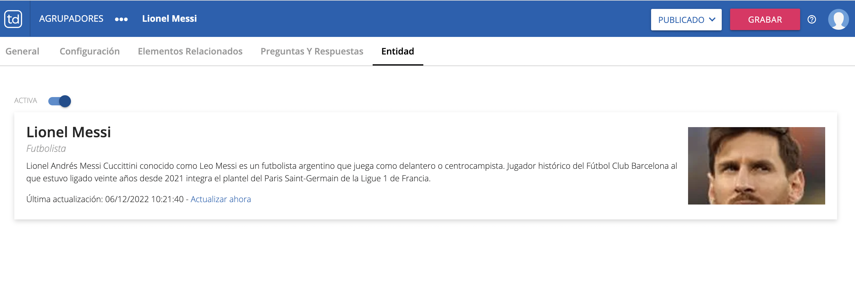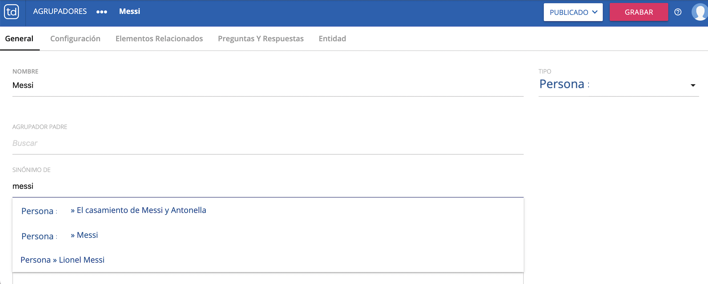 Sinónimo de: En este campo permite asociar el nuevo tag a uno ya existente para que indexe en la misma página. Para determinar este campo, recomendamos usar Google Trends (Google Trends, también denominado Tendencias de búsqueda de Google, es una herramienta de Google Labs que muestra los términos de búsqueda más populares del pasado reciente) y utilizamos los términos más comunes con los que las personas realizan las búsquedas de nuestro tag, por ejemplo cuando escribimos la palabra “Messi” nos muestra las opciones que ya fueron creadas previamente: