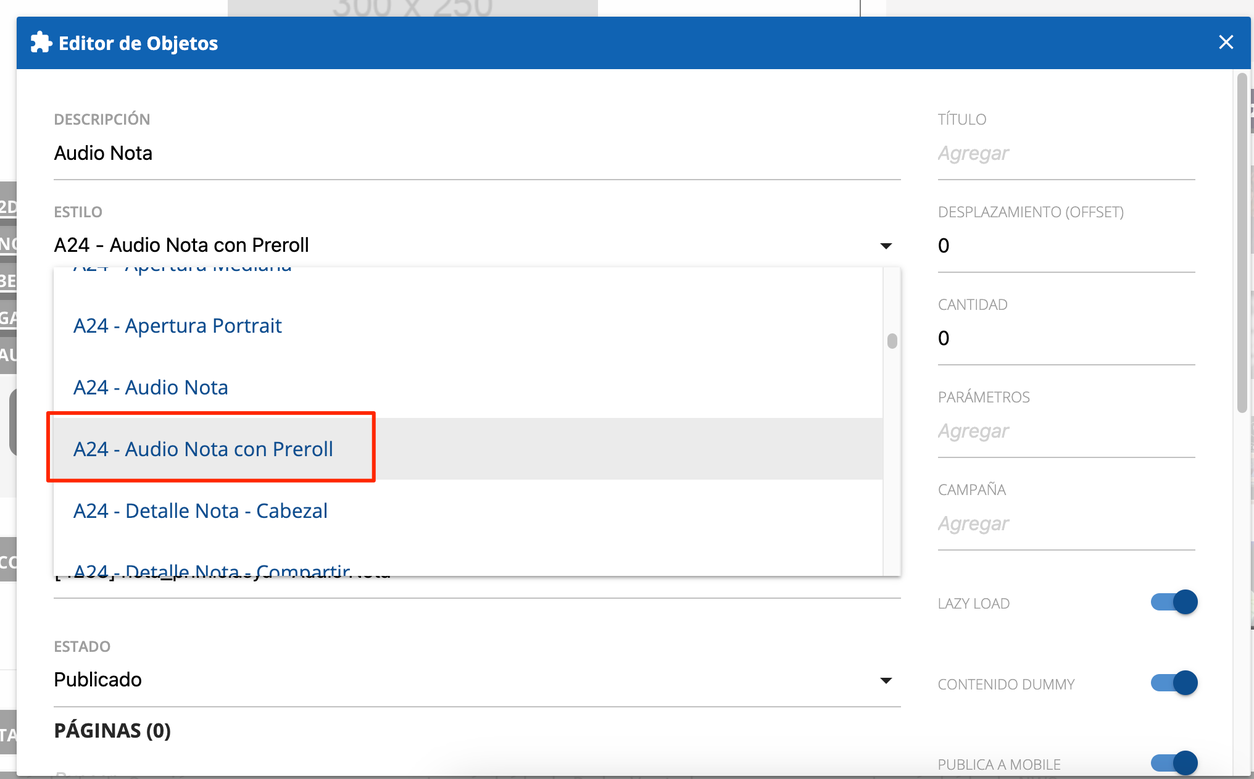 En el campo Estilo, selecciona "Audio Nota con Preroll".