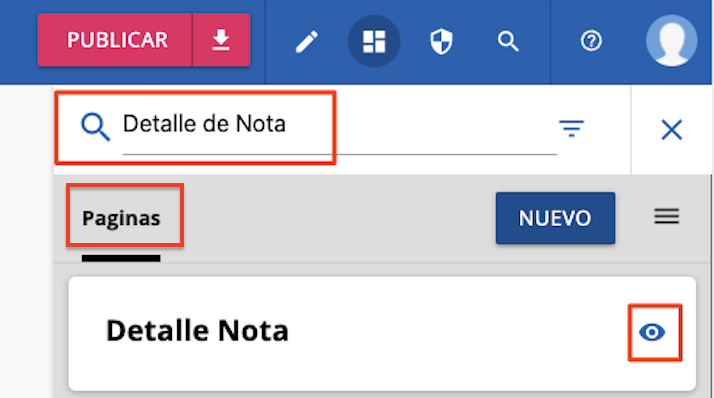 3. En el menú hamburguesa (≡), selecciona Páginas. Luego, busca la página “Detalle nota” y haz click en Construir (ojo).