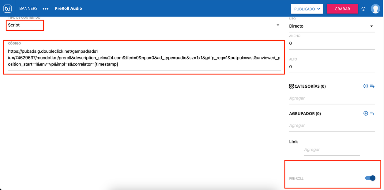En el campo Preroll, busca el banner que creaste en el paso “Crea un banner del tipo Script” y selecciónalo para que quede relacionado con el objeto.