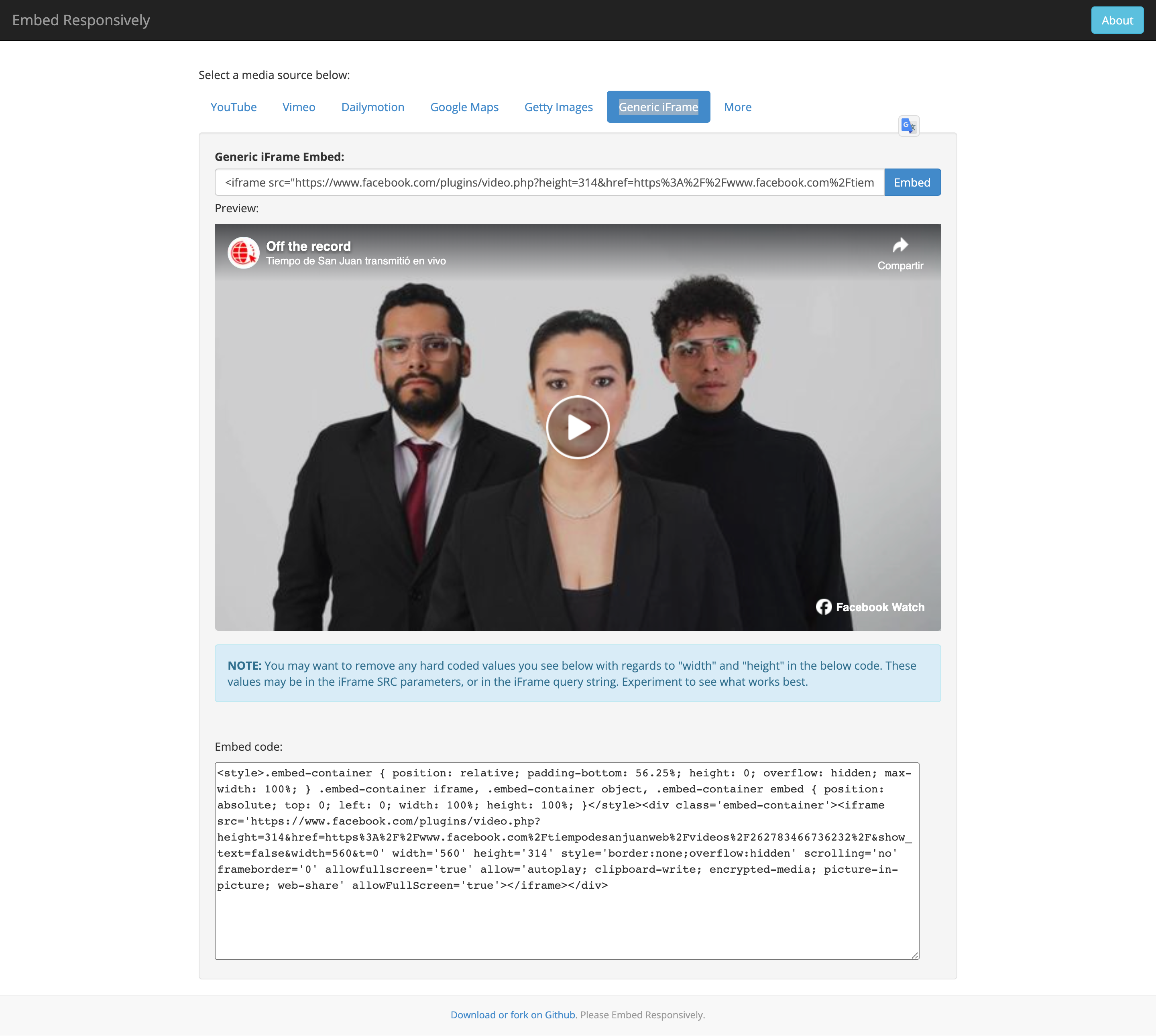 Ingresando al https://embedresponsively.com/ vas a encontrar la posibilidad seleccionar algunas de las redes predefinidas, como la opción de Generic iFrame, allí es donde pegaremos cualquier código de inserción que debamos transformar
