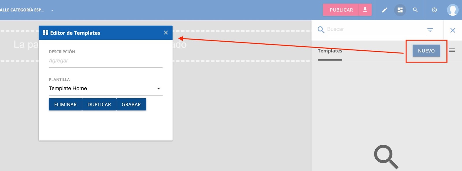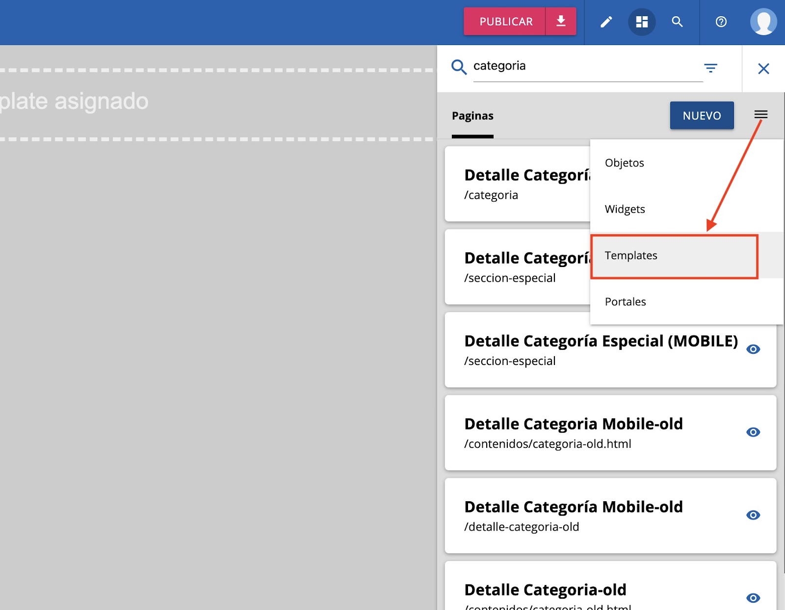 Para asignarle el template, deberás desplegar el menú hamburguesa que se encuentra a la derecha del botón NUEVO y das click en Templates