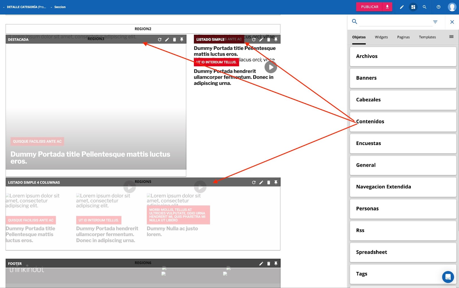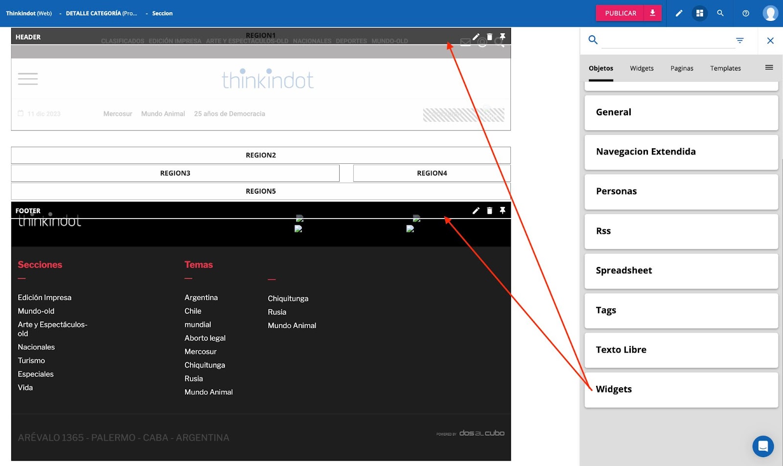 Allí encontrarás todos los objetos a agregar, es importante que agregues el HEADER y el FOOTER siempre, para hacerlo tendrás que arrastrar el widget a la región correspondiente
