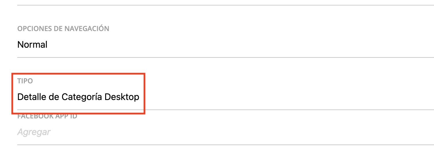 • Tipo: en este campo, deberás determinar qué tipo de página deseas crear, en este caso, se trata de un Detalle Categoría de Desktop