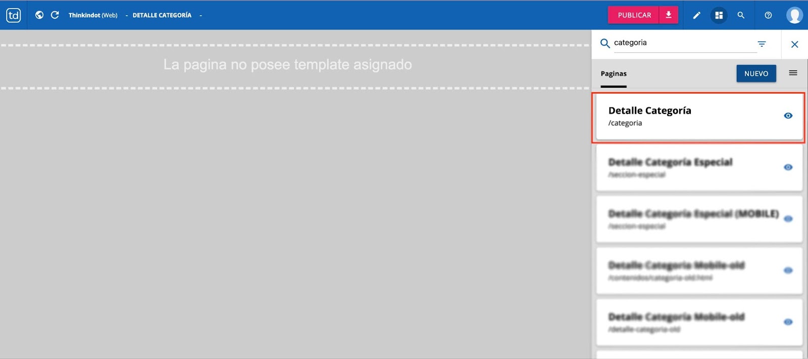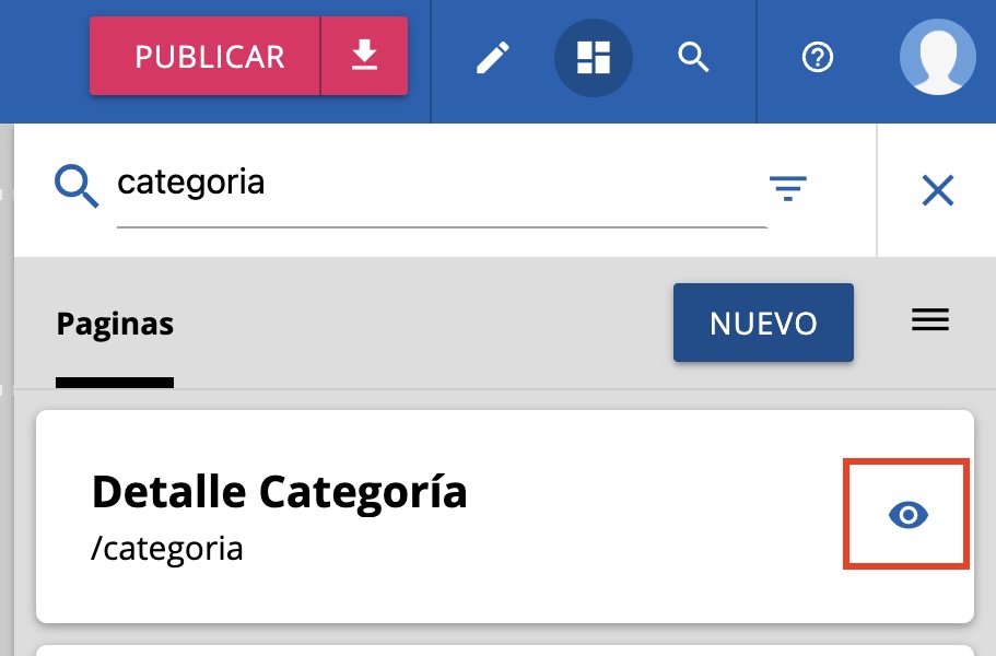 Regresa al espacio de páginas y busca Detalle Categoría Desktop en la barra de búsqueda. Haz clic en el icono del ojo 👁 que está ubicado a la derecha del nombre para construir la página.