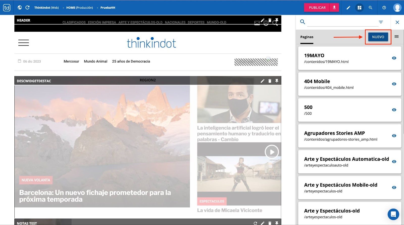 Ingresar a la aplicación Portada y acceder al administrador de páginas