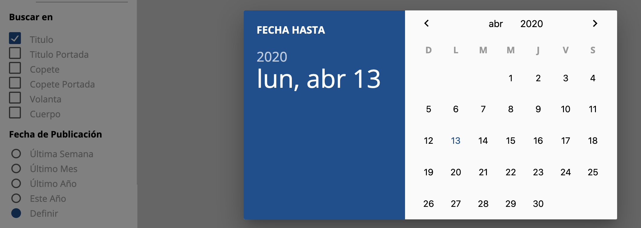 Si has seleccionado la opción “Definir”, podrás utilizar un rango de búsqueda personalizado. Aquí se desplegará una ventana para configurar la fecha de inicio (“desde”) y la fecha de límite (“hasta”) en la que deseas realizar la búsqueda. A continuación las imágenes de referencia.