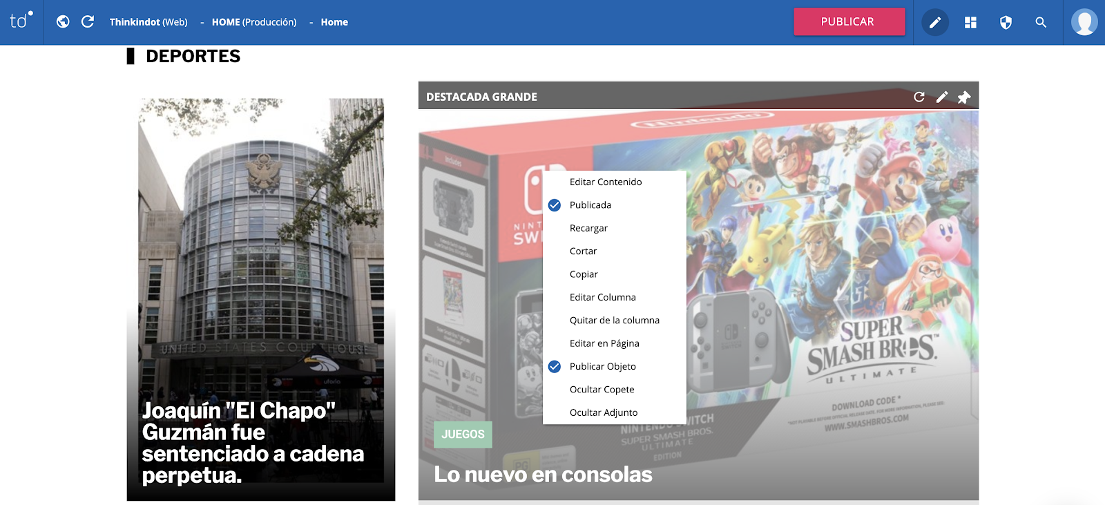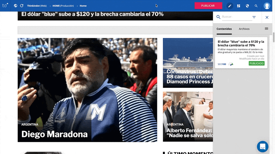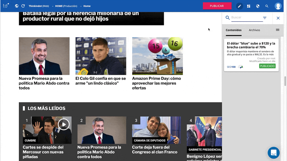 Las notas que se muestran en la home o portada del sitio dependen de los “temas calientes” del día. Sabemos que esto puede cambiar minuto a minuto, por eso Thinkindot® hace que destacar la nota que queremos mostrar en algún bloque de la portada (o quitarla) sea una tarea fácil, dinámica, ágil, sencilla y sobre todo, veloz.