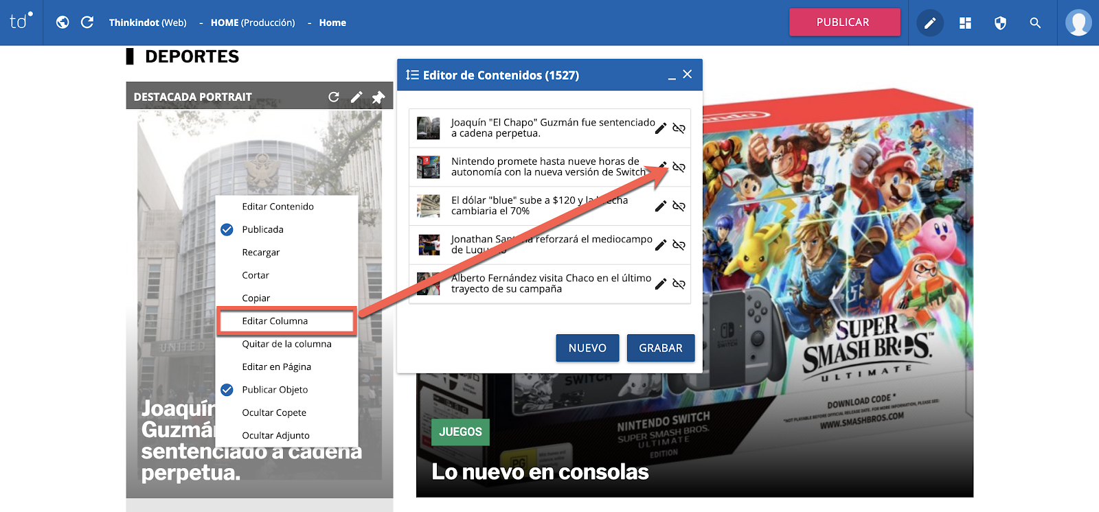 Quitar de la columna: permite eliminar / quitar esa nota de la portada.