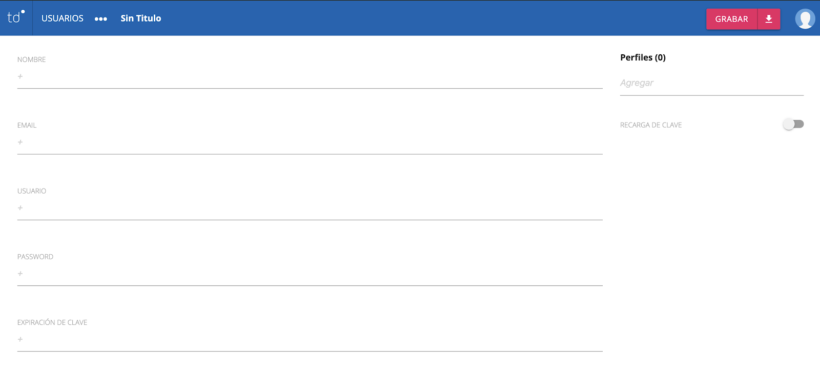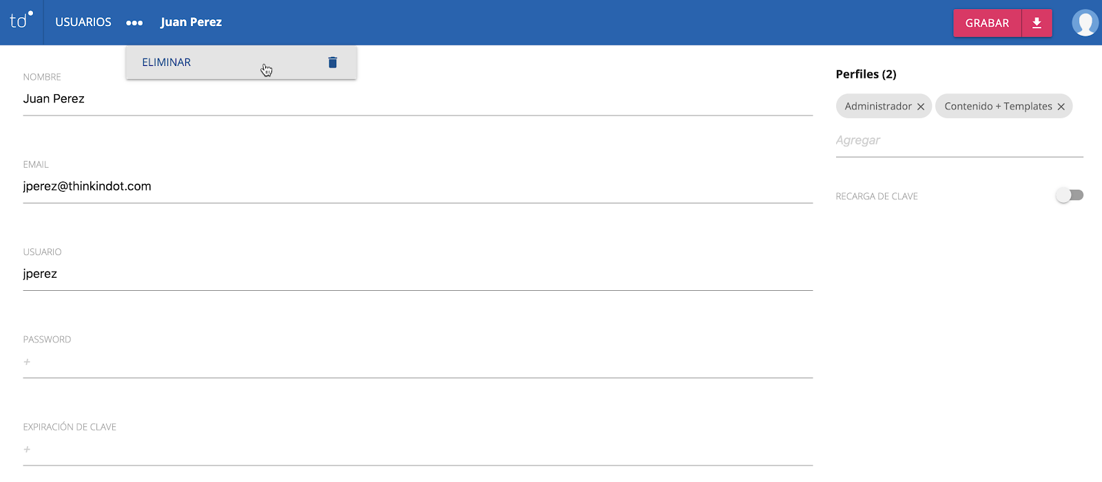 Si por seguridad, deseas que el usuario tenga la posibilidad de cambiar la contraseña, deberás habilitar la función Recarga de Clave deslizando el botón hacia la derecha. De esta forma, la primera vez que el usuario se loguee en el sistema, el mismo le solicitará una nueva contraseña que será propia y personal de ese usuario.