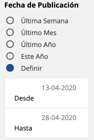 Filtro por Fecha de publicación: Este filtro permite limitar la búsqueda a una fecha o rango de fechas específicas. Para utilizar este filtro, debes seleccionar el rangos predeterminado que más se ajuste a tu necesidad, o bien definir las fechas de forma personalizada seleccionado la opción “Definir”.