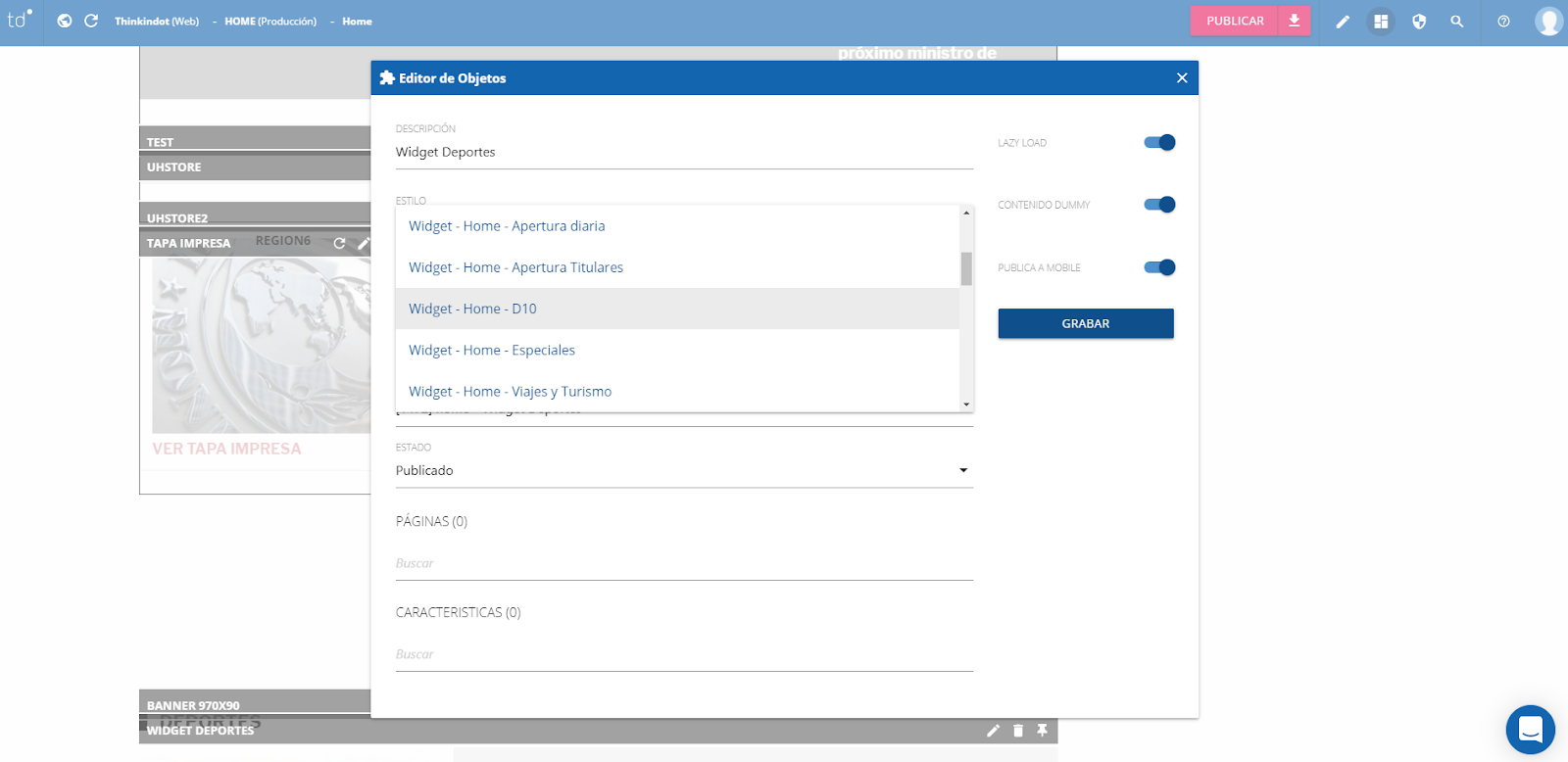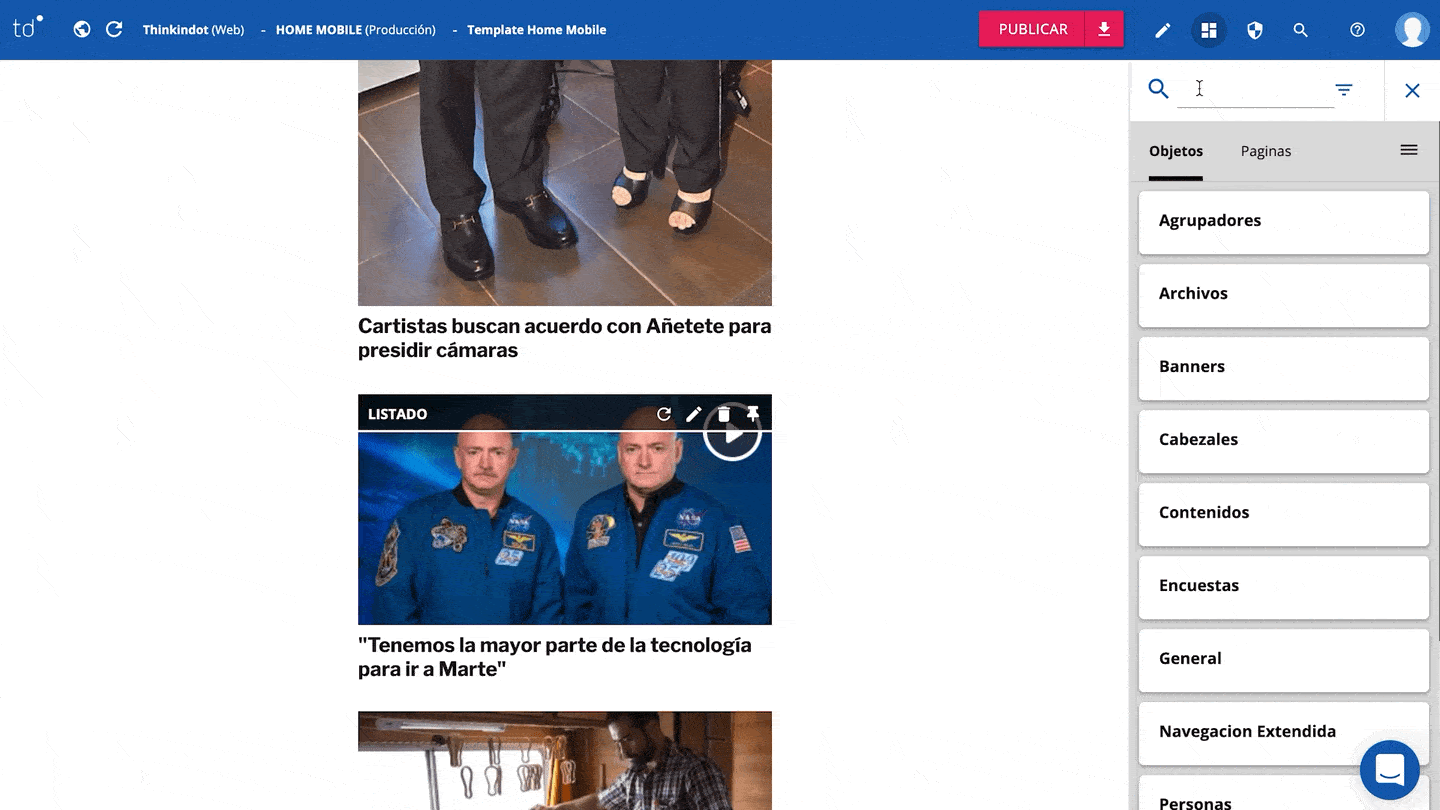 Luego, deberás hacer click en la lupa nuevamente para abrir el administrador de objetos y mediante drag & drop, “arrastrar” Widget hasta la ubicación de la home donde quiero que se visualice y “suelto”.