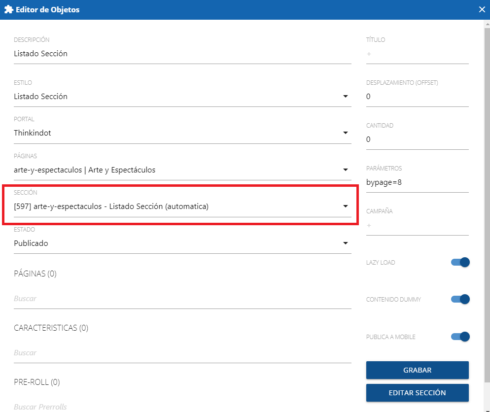 Entramos al editor de objetos, para tomar el ID del objeto que se encuentra en el campo Sección. Una vez que obtengas ese número, deberás cerrar el editor de objetivo haciendo clic en X