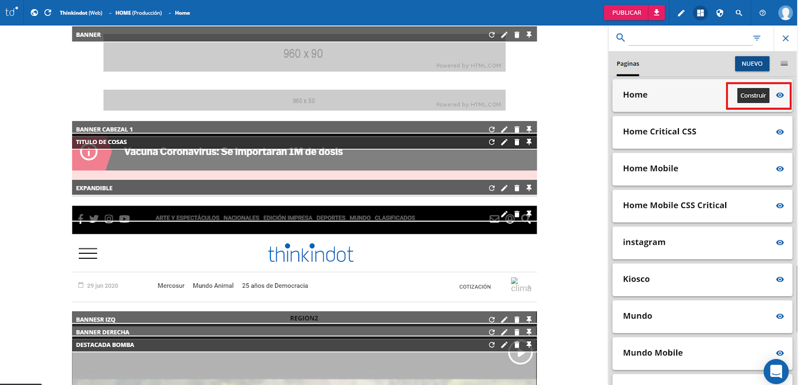 Una vez que obtuvimos los datos del objeto, debemos dirigirnos a la sección de nuestro sitio donde queremos replicar el objeto que identificamos en el paso anterior. Para ello, deberás hacer click en la lupa. En el Administrador de Páginas, deberás buscar la página de destino, en nuestro caso “Home mobile” y hacer click en el “ojo” para construirla.