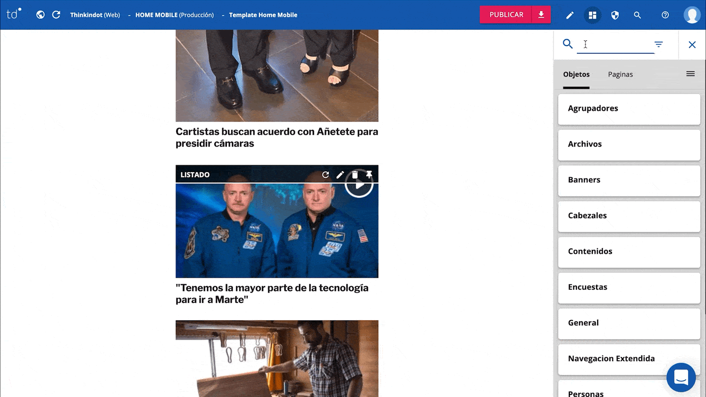 Luego, deberás hacer click en la lupa nuevamente para abrir el administrador de objetos y mediante drag & drop, “arrastrar” contenidos hasta la ubicación de la home donde quiero que se visualice y “suelto”. (Aclaración: siempre selecciono contenido porque voy a generar una nota).