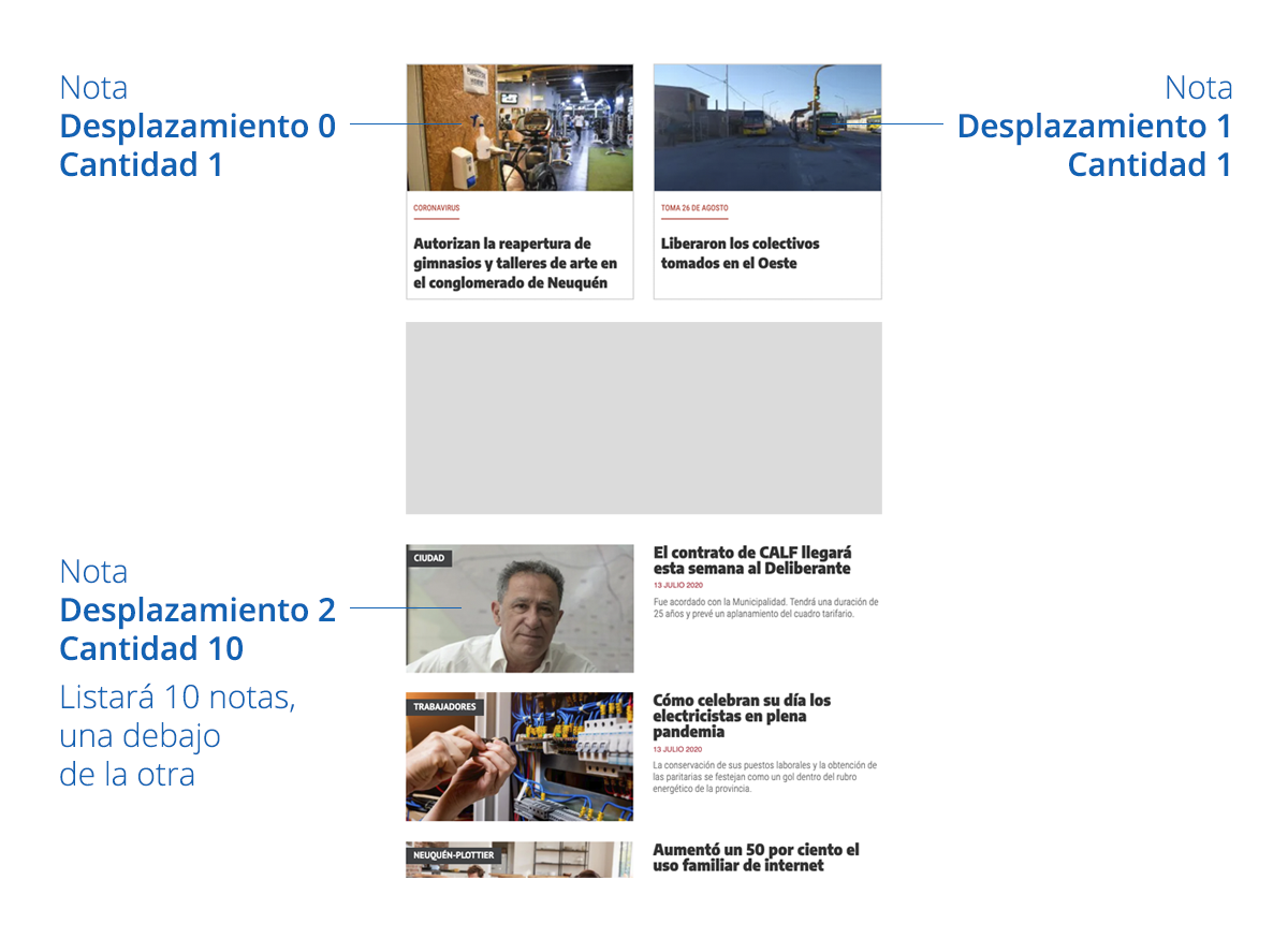 (*) Es importante que en el caso de bloques de contenido se respeten los desplazamientos y cantidad para evitar que se repitan o no muestre alguna de las notas del listado.
