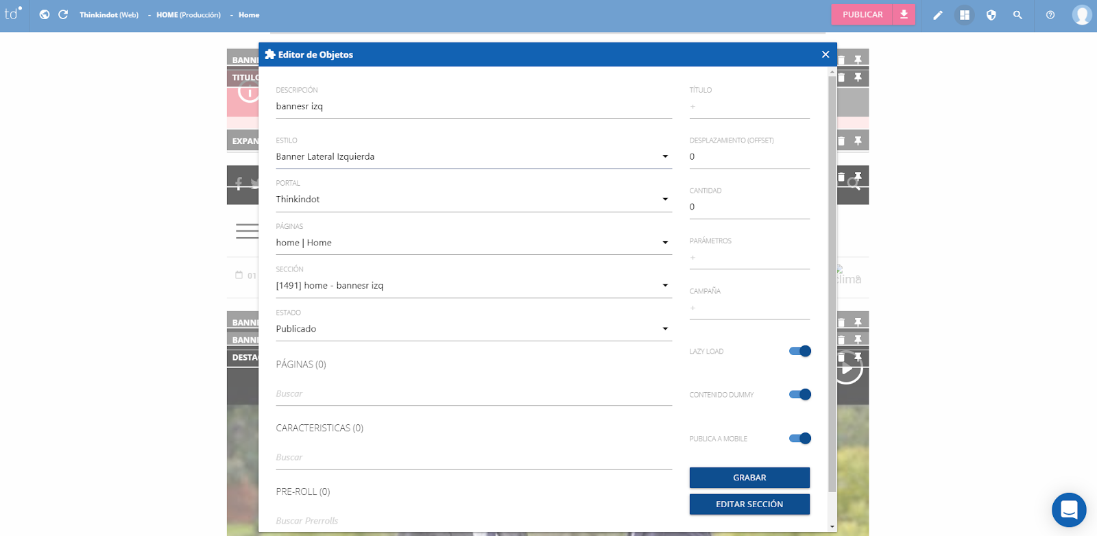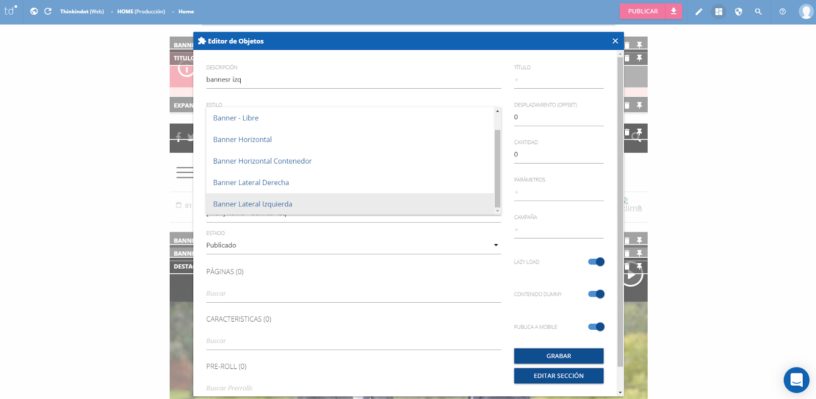 • Sección: este campo no requiere ninguna acción de configuración ya que se completa automáticamente por sistema. Aquí, el CMS le adjudicará un número de identificación para poder vincular este espacio con otros espacios (espacios de notas, widgets, banners). En caso de querer vincular espacios ya existentes, sugerimos visitar el siguiente instructivo LINK A replicar contenidos en distintos entornos (web/mobile)