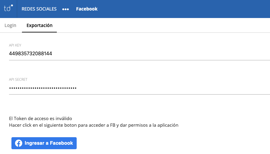 Al clickear en Facebook, se abrirá una ventana con dos solapas: Login y Exportación: