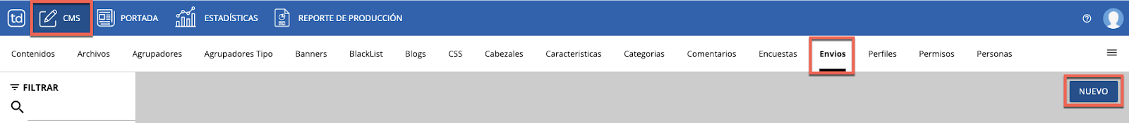 Para comenzar a configurar listas de envío de tus newsletters, ingresa a CMS y luego al administrador de Envíos. Clickea en el botón Nuevo para que se abra el editor de envíos.
