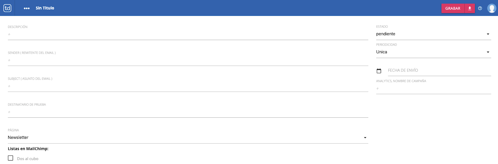 Una vez que hayas configurado todos los campos, si deseas enviar enviar el Newsletter o dejarlo programado, recordá configurar el estado en “pendiente” y clickea en Grabar.