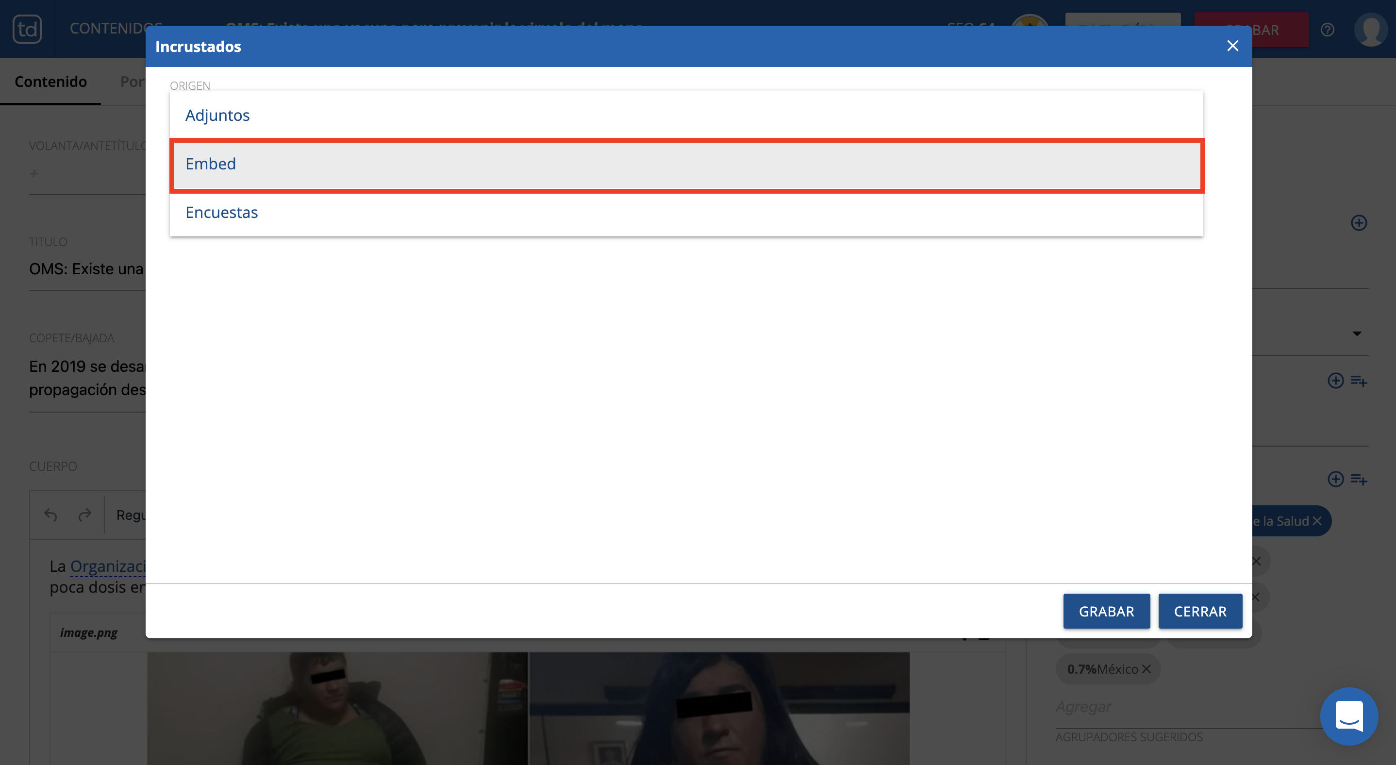 Luego sobre el editor de contenido hacer clickear en el botón EMBEBER, y cambiar el origen a EMBED: