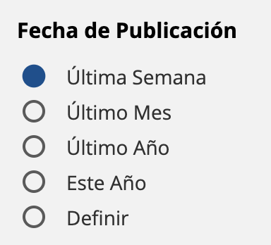 Filtro por Fecha de publicación: Este filtro permite limitar la búsqueda a una fecha o rango de fechas específicas. Para utilizar este filtro, debes seleccionar el rangos predeterminado que más se ajuste a tu necesidad, o bien definir las fechas de forma personalizada seleccionado la opción “Definir”.