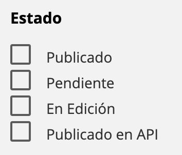 Estado de la nota: Permite buscar y encontrar contenidos según su estado, siendo estos en edición, pendientes o bien, publicados. Para utilizar este filtro, deberás clickear la opción que se ajusta a tu necesidad de búsqueda.