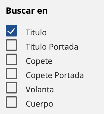 Palabra clave: Encuentra contenido en base a una o más palabras determinadas. Deberás tener en cuenta que busca y muestra como resultado todo el contenido existente en el que se mencione esa/s palabra/s. Es decir, Thinkindot® busca siempre TODAS las palabras ingresadas por separado (por ejemplo, si buscas “Casa Rosada” se mostrarán las notas que contengan AMBAS palabras, pero no necesariamente juntas o en ese orden). Para utilizar este filtro, escribes la palabra a buscar en el espacio destinado a tal efecto y clickeas en el ícono de la lupa. Ten en cuenta también que, por default, sólo buscará la palabra en el campo “título” ya que es el único seleccionado por el sistema de forma automática; si quieres buscar en otros componentes de la nota, deberás tildarlos para seleccionarlos.