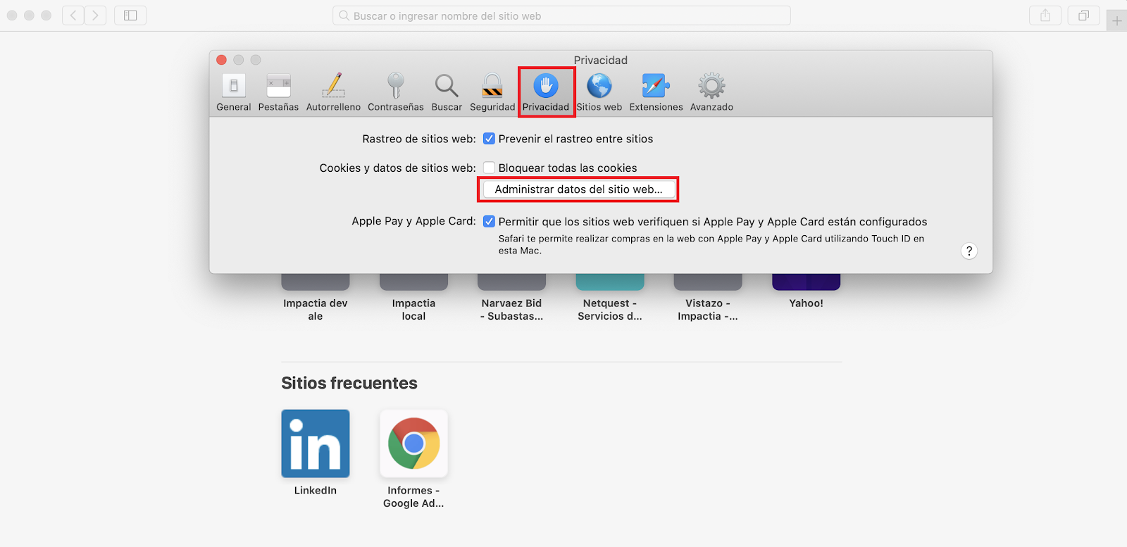 Una vez dentro de “Preferencias” deberás seleccionar la opción “Privacidad” y luego clickear en “Administrar datos del sitio web”, tal como mostramos a continuación:
