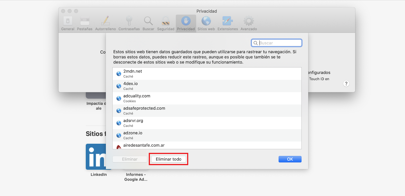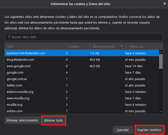 Se abrirá una ventana con todas las cookies y datos del sitio. Clickea en “Eliminar todo” y luego en “Guardar cambios”.