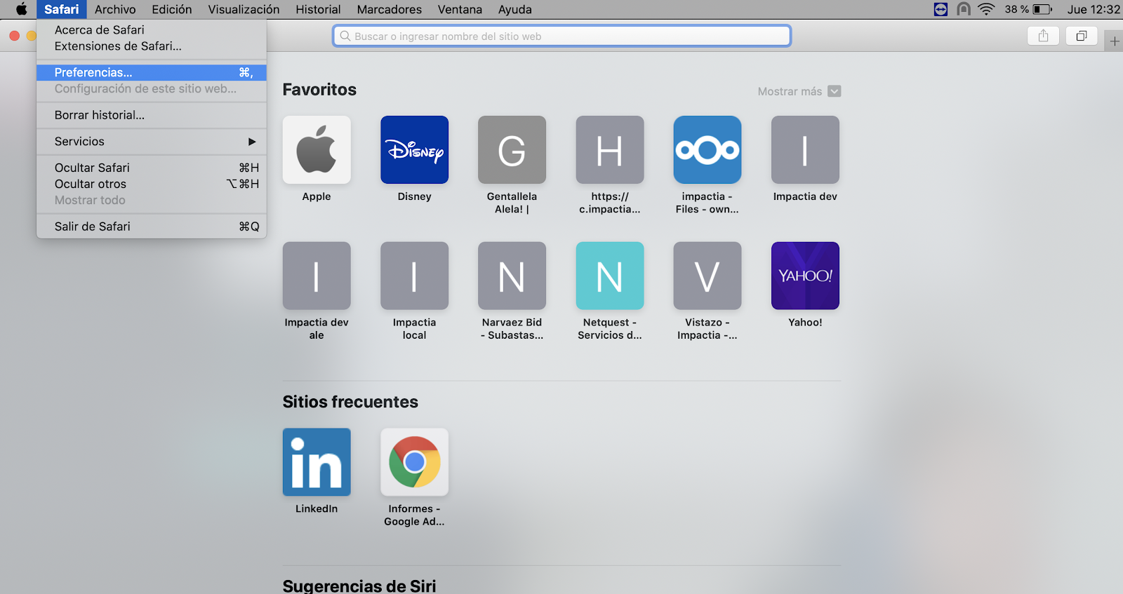Acceder a Safari, hacer click en “Safari” y seleccionar “Preferencias”, tal como se muestra en la siguiente imagen: