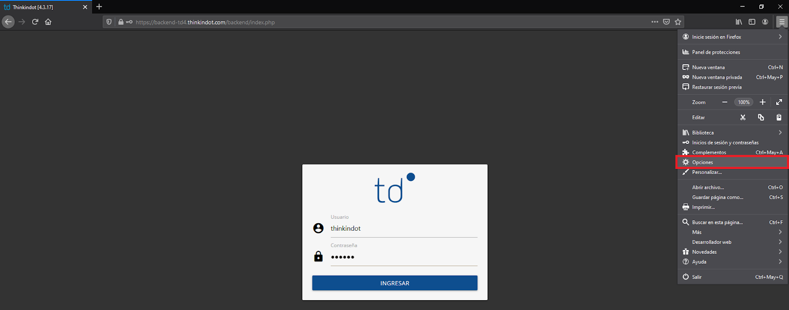 Acceder a Firefox, hacer click en las “3 líneas” (menú hamburguesa) que aparecen sobre el final de la barra del buscador y luego seleccionar “Opciones”, tal como se muestra en la siguiente imagen: