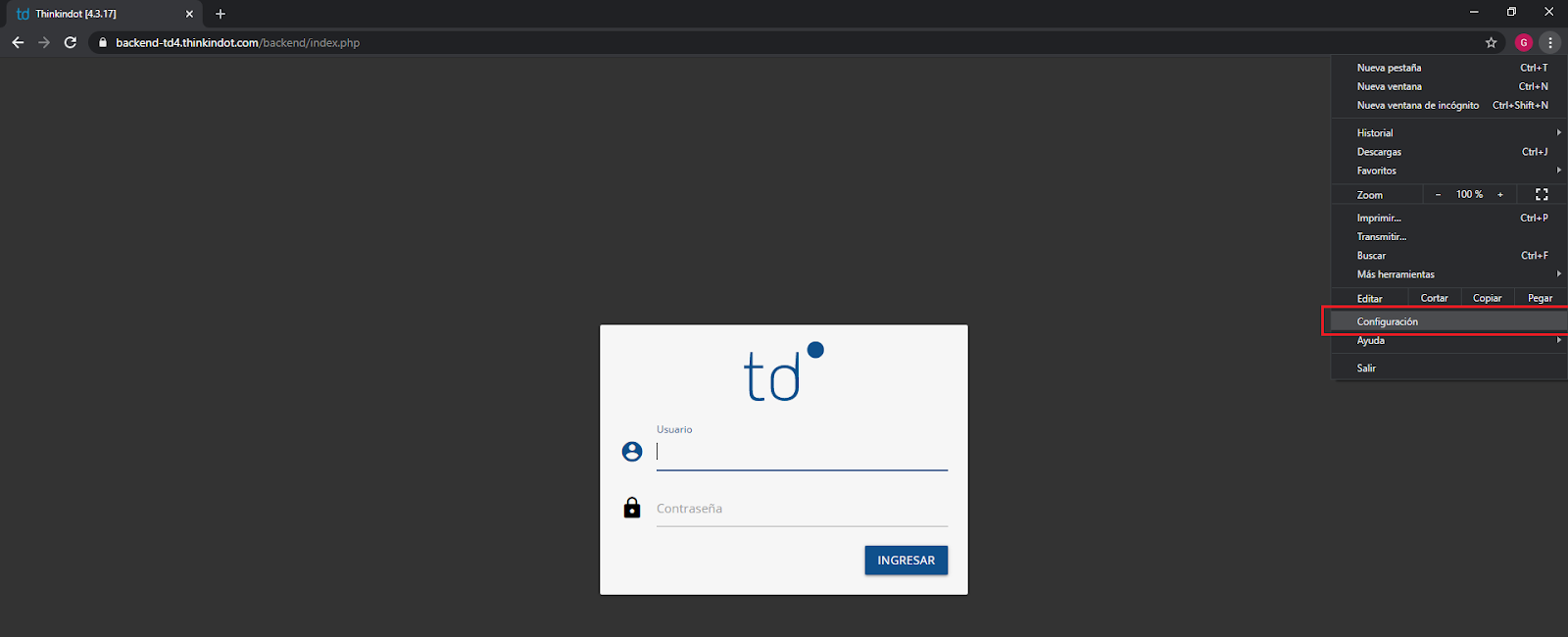 Acceder a Chrome, hacer click en los “3 puntitos” que aparecen sobre el final de la barra del buscador y luego seleccionar “Configuración”, tal como se muestra en la siguiente imagen: