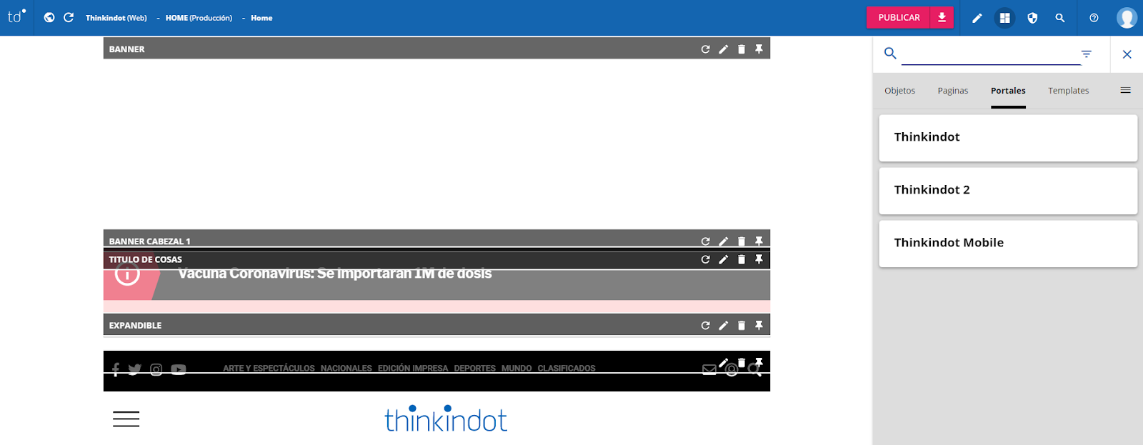 Una vez que cuentes con los códigos Adsense (también llamado “Script-head”) y ADS.TXT, deberás dirigirte a Thinkindot® CMS e ingresar en la aplicación Portada, Modo template, y clickear en el administrador de Portales.