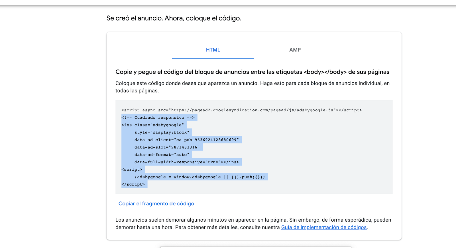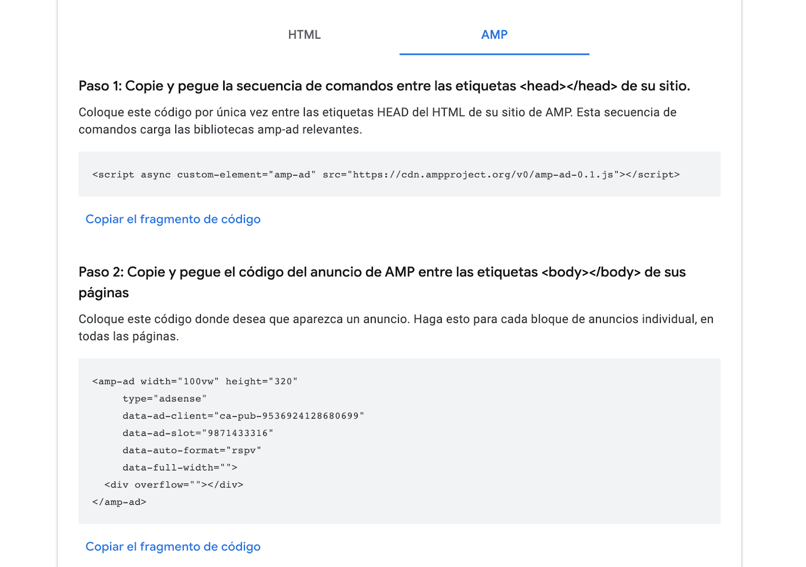 Una vez configurado el anuncio, automáticamente se genera un HTML. Ten en cuenta que Google genera dos versiones de html, una para desktop y otra para AMP. Cada una de ellas estará en una pestaña distinta, tal como se muestra en las imágenes a continuación.