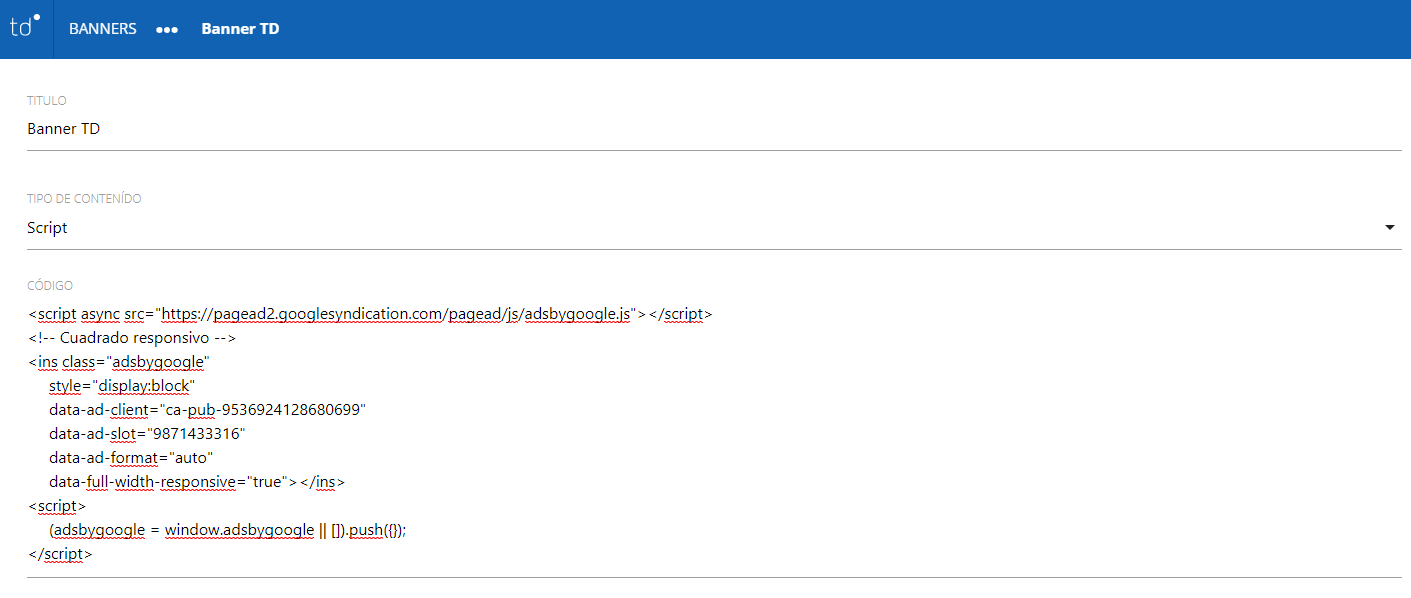 Una vez que hayas obtenido los códigos de los anuncios provistos por Google, deberás copiarlos e ingresar a Thinkindot® CMS.