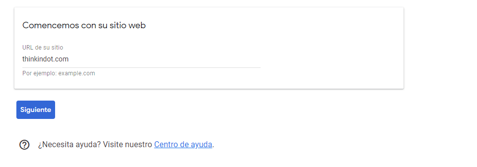 En el campo URL de su sitio, deberás agregar URL del sitio completa y click en el botón azul “Siguiente”
