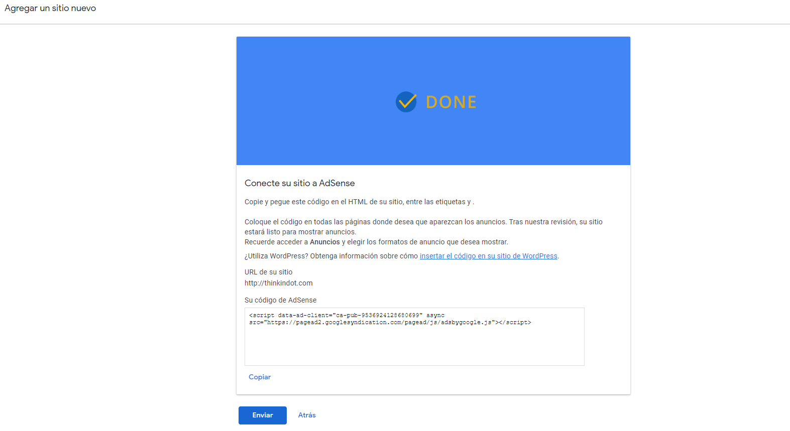 Al hacer click en siguiente, verás una pantalla que indica que el sitio ya ha sido dado de alta. En esa misma pantalla encontrarás el “Código Adsense”, también llamado “Script_Head”.