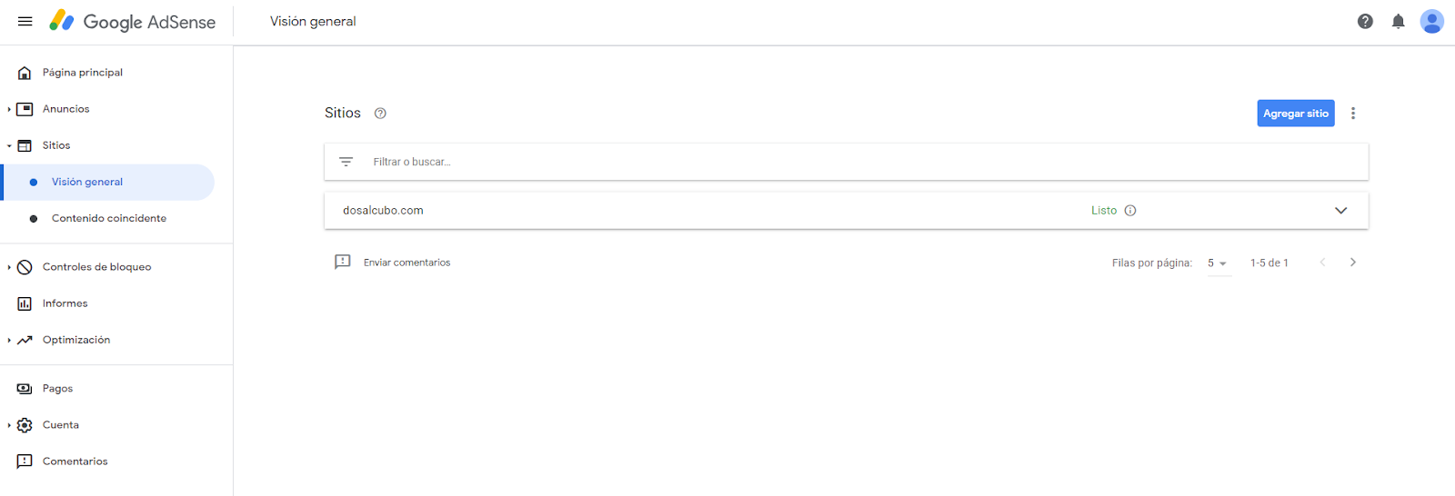 Cuando esté disponible, serás notificado por mail y encontrarás la validación en Google Adsense / Sitios / Visión General, junto al detalle del estado de aprobación de cada uno de los sitios.